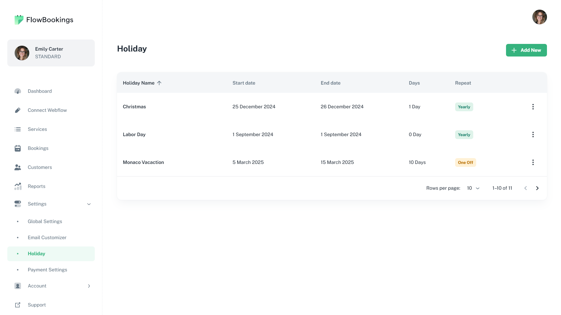 FlowBookings lets you create both single-day and multi-day holidays. You can also choose to repeat Holidays yearly.&#x20;